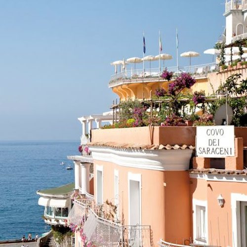 Hotel Covo Dei Saraceni Positano is positioned right on the beach. You can actually hear the waves crashing, and feel the soothing breezes. It is very close to the main group of shops, bars and restaurants. It is mostly an uphill walk to the top of the town. It should take about ten minutes. Not too difficult, not a lot of stairs. Ferries and private boats are also just outside the door. Making it really convenient to take for day trips to Sorrento, Amalfi and Capri.