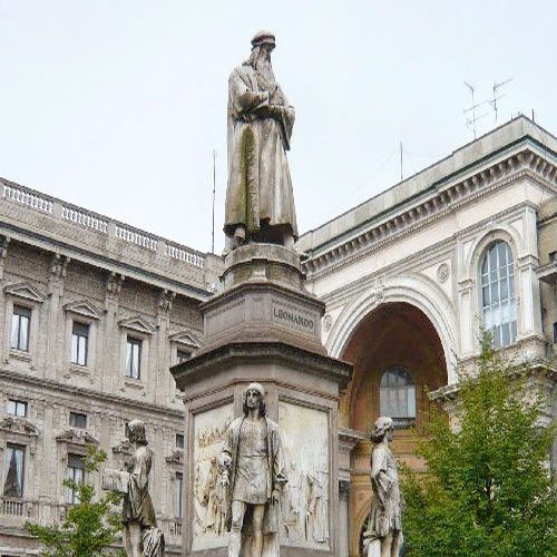 In the center of Piazza della Scala Milan, there is a large statue of Leonardo da Vinci. It was sculpted in 1872, by Pietro Magni. The base of the statue illustrates paintings, sculpting, engineering and architecture. At the foot of the base, stands four of Leonardo da Vinci favorite students that he mastered. Leonardo da Vinci lived and created numerous artworks in several cities. However, his most famous masterpiece, The Last Supper is located in Church of Santa Maria dell Grazie.