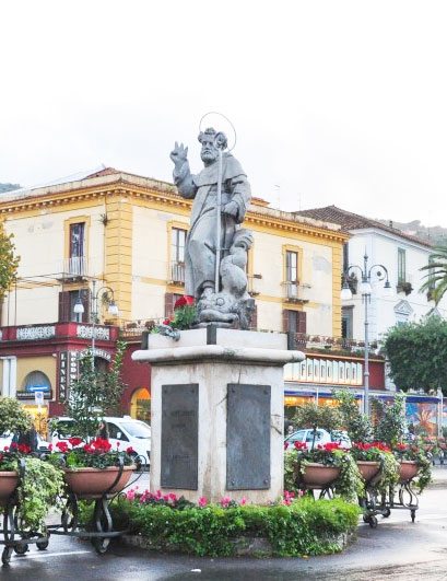 Piazza Tasso Sorrento is named after the native poet Torquato Tasso. He was born 1544 and died in 1595, just before he was to be crowned Poet Laureate. A beautiful marble image of him stands in the center of the square. The other large statue is of Sant Antonio Abate, the patron saint of Sorrento. At the north eastern side of the square is Church of Santa Maria del Carmine, with its gorgeous Rococo facade of gleaming white-and-yellow stucco.